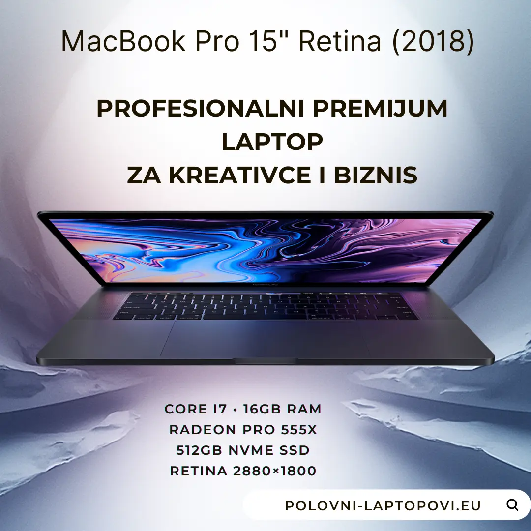 Apple Macbook Pro 15 Retina 2018 u odličnom stanju. Ovaj model spaja snažan Intel i7 procesor, 16 GB RAM memorije i brz NVMe SSD. Idealan je za profesionalce koji trebaju pouzdan, prenosiv i moćan računar za zahtevne zadatke.